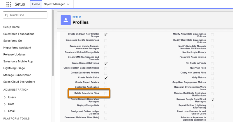 Spring ’26 adds a way to let trusted users delete Salesforce Files without handing out broad admin-like permissions. This provides a stronger least-privilege posture and reduces the long-standing friction where file cleanup often required admin escalation.